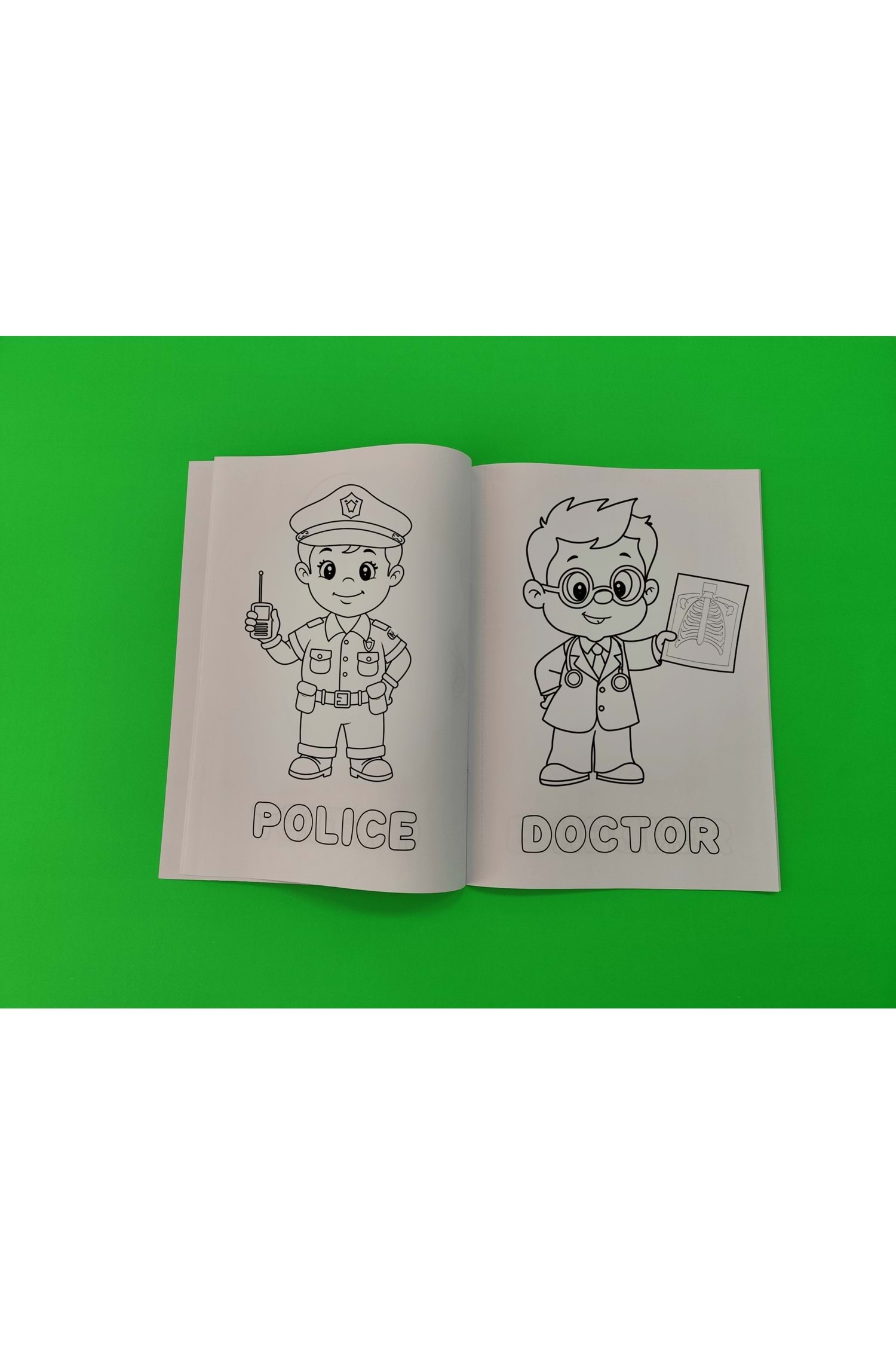 Her sayfada meslek çizimlerinin altında İngilizce kelimeler yer alıyor (örneğin, "pilot" veya "firefighter"). Çocuklar boyama yaparken İngilizce öğrenir, bu da dil becerilerini geliştirmelerine katkı sağlar. Cesur ve dinamik meslek tasarımları, macera dolu bir boyama yolculuğu sunar. Mavi tonlardaki kapak tasarımıyla dikkat çeken bu kitap, dayanıklı kağıtlara sahiptir.